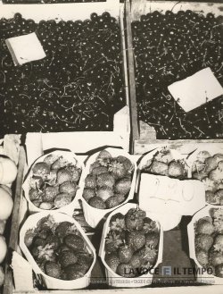 Acquisto foto "Fragole e ciliegie in un banco di frutta"