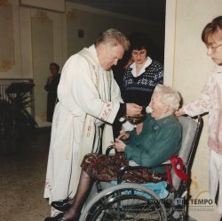 Acquisto foto "Don Peradotto porta l'Eucarestia ad una anziana signora in carrozzella"
