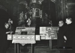 Acquisto foto "Il cardinale Saldarini davanti ad alcuni pannelli esplicativi in Duomo"