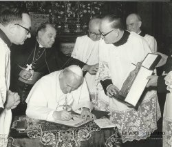 Acquisto foto "Giovanni Paolo II firma un documento sotto gli occhi del Cardinale Ballestrero e don Bretto"
