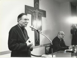 il cardinale saldarini parla ad una conferenza a torino, in piedi vicino al crocifisso | € 0,00 |