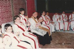 il cardinale saldarini sta ascoltando la messa seduto in mezzo ai chierichetti che applaudono | € 0,00 |