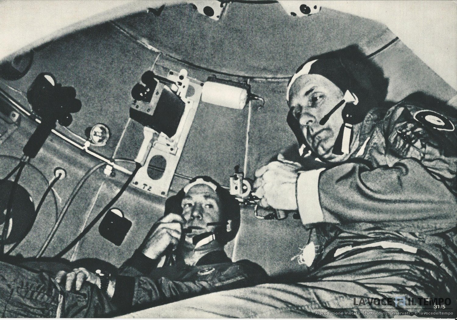 due astronauti nella navetta spaziale che parlano con delle cuffie e un microfono