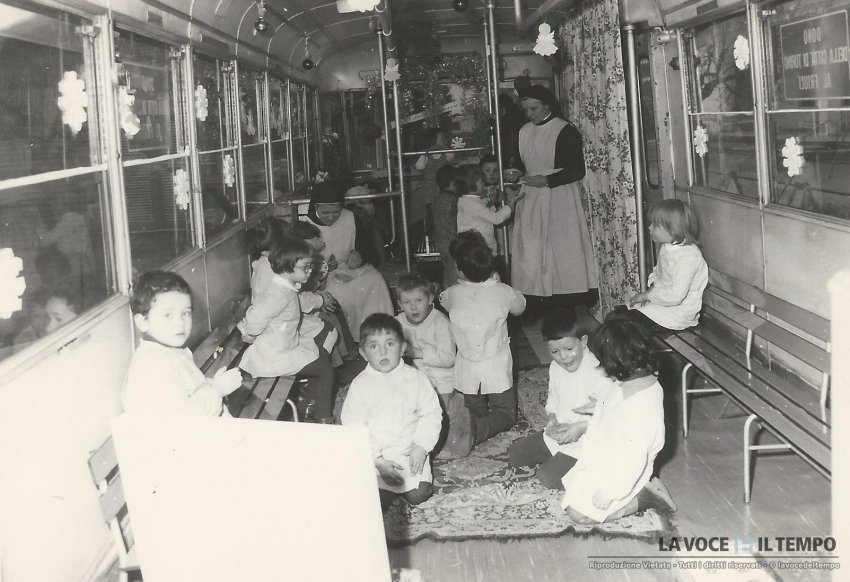 Bambini giocano in una "scuola" sul pullman donato dalla Città di Torino, dopo il terremoto
