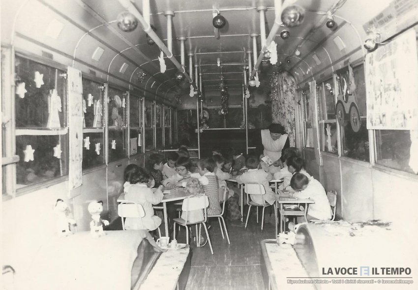 Bambini in una "scuola" sul pullman donato dalla Città di Torino, dopo il terremoto