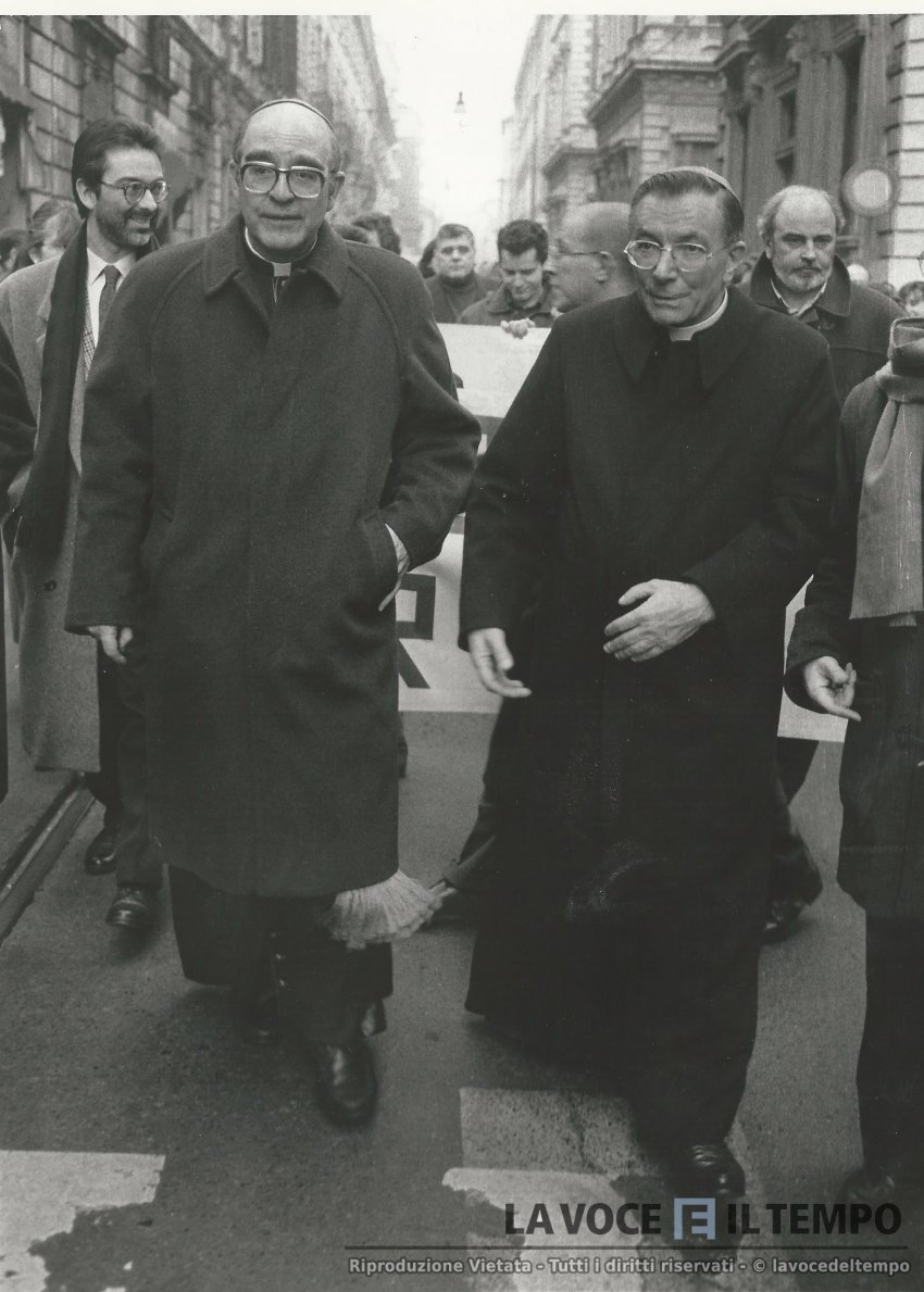 Cardinale Saldarini con il cardinale Alfonso Lobez Trujillo alla marcia per la vita con a sinistra Giampiero Leo