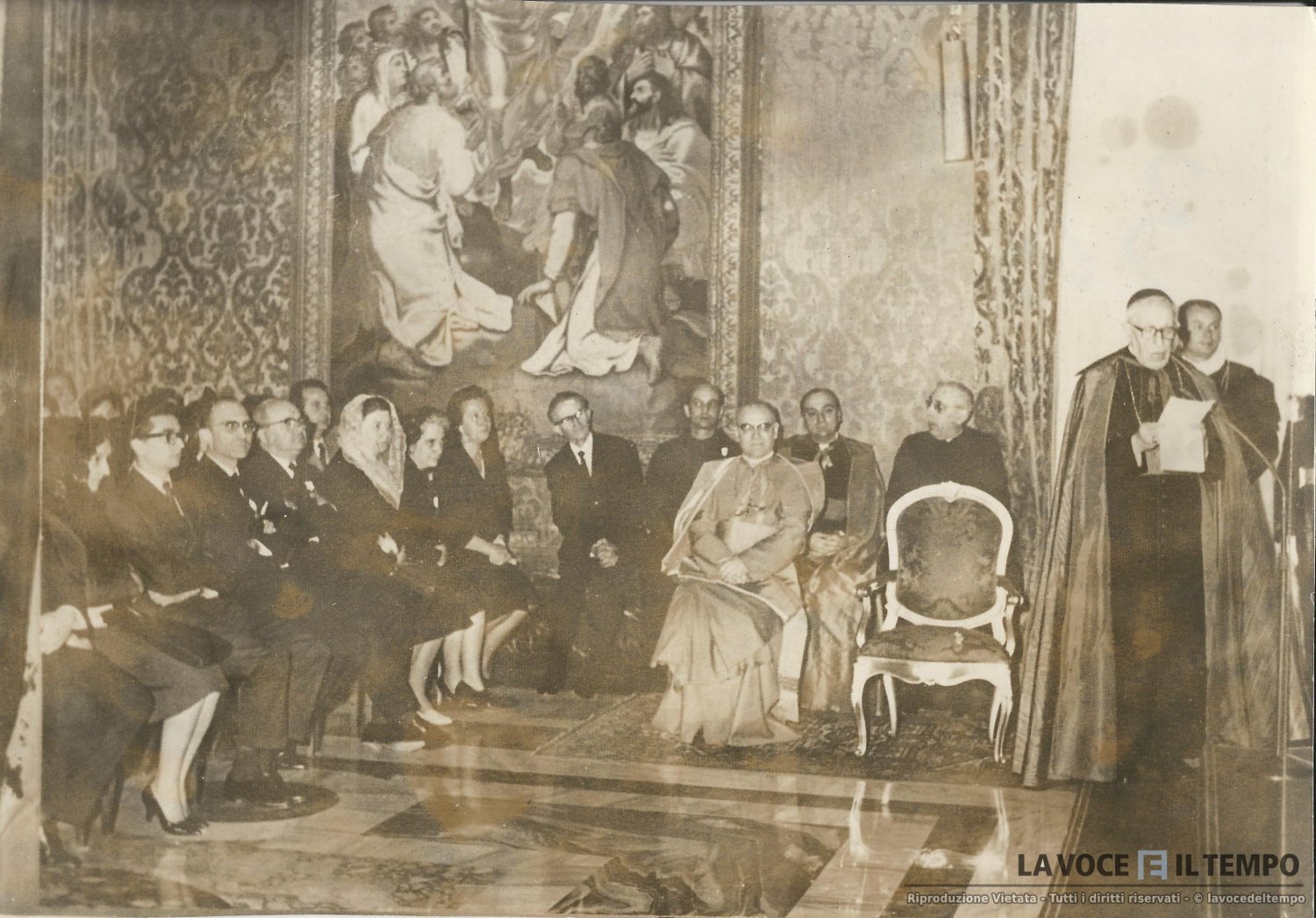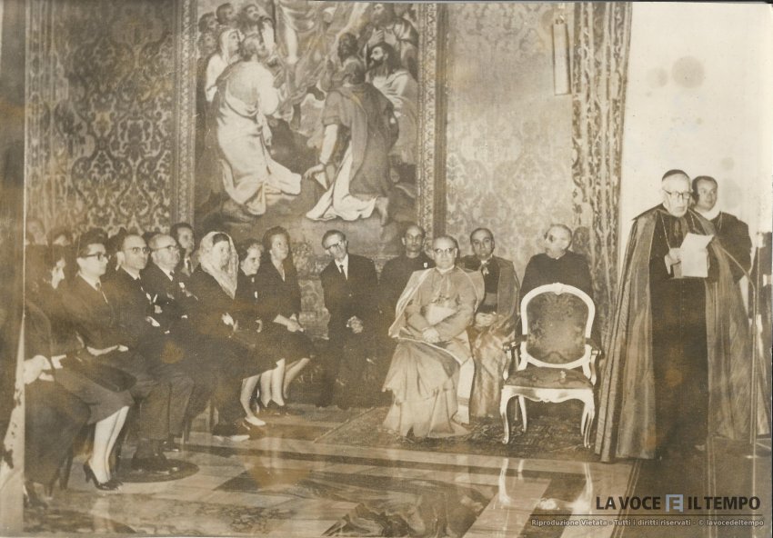 L'Arcivescovo Fossati parla a un gruppo di persone. In prima fila la signora Trabucco, presidente diocesana AC, e il dott. Aldo Morgando, presidente diocesano giunta AC