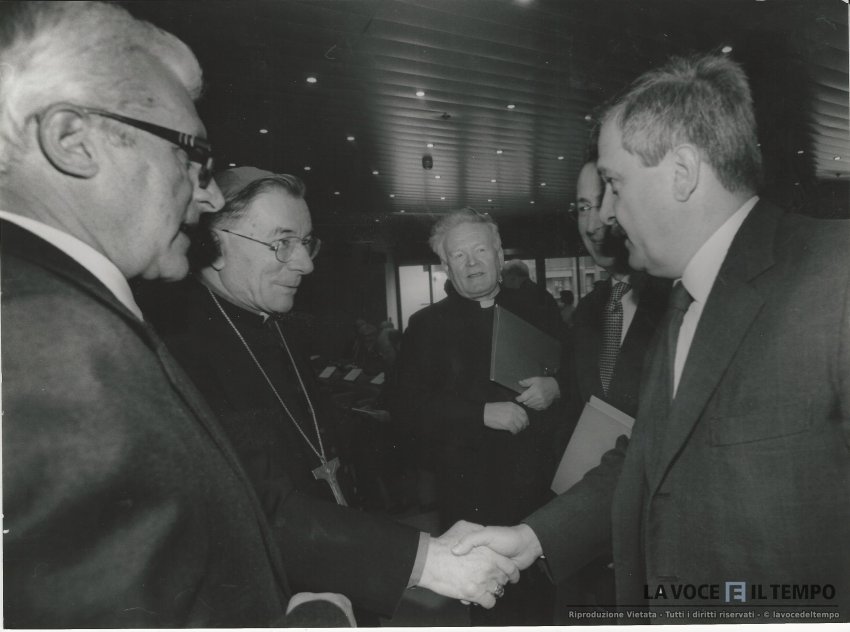il cardinale saldarini è alla fondazione Agnelli, per un convegno sulla Sindone. il cardinale parla con ludovico passerin d'entreves