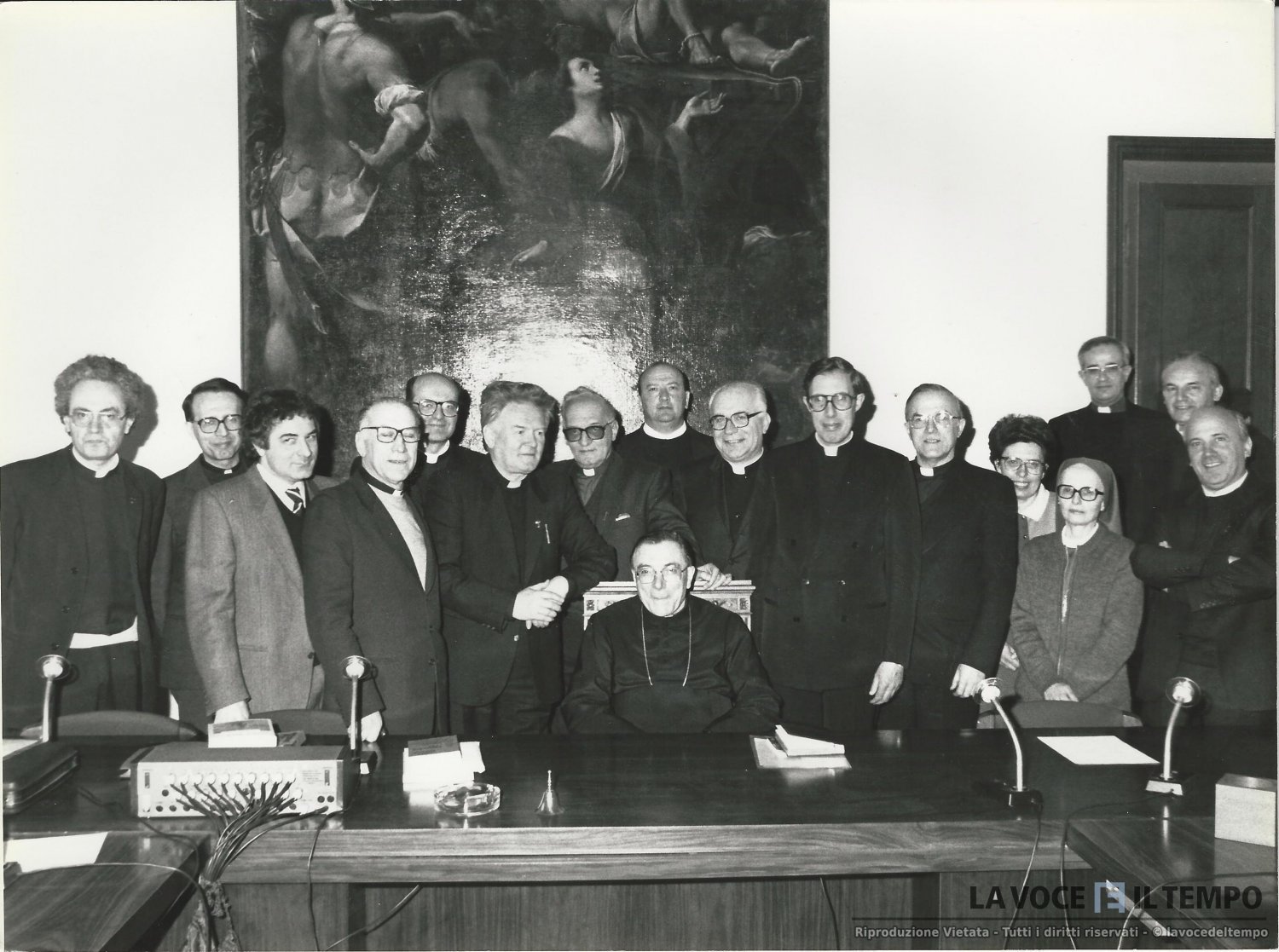 il cardinale saldarini si fa fare una foto con tutti i preti e suore della facoltà teologica. Alcuni di essi sono: Don Franco Peradotto, Don Riva, Marco Bonatti e Renzo Savarino