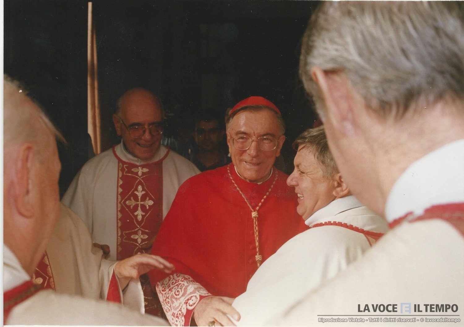 il cardinale saldarini parla e sorride insieme ad altri parroci