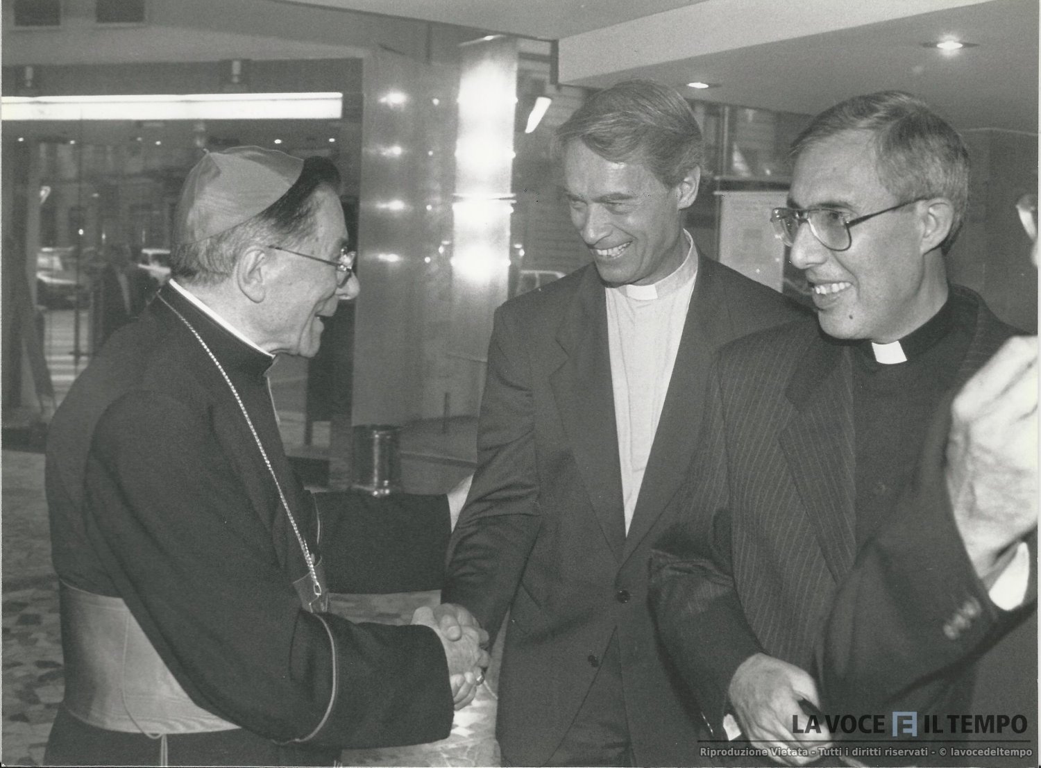 il cardinale saldarini durante una conferenza al teatro colosseo incontra don Piero Gallo, parroco di S. Salvario, e don Paolo Ripa, vicario per i religiosi.