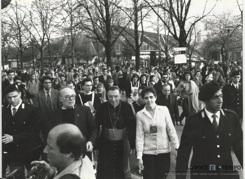 il cardinale saldarini è al Parco Ruffini, durante la festa dei giovani, con Don Giovanni Villata e folla con anche carabinieri, fotografi