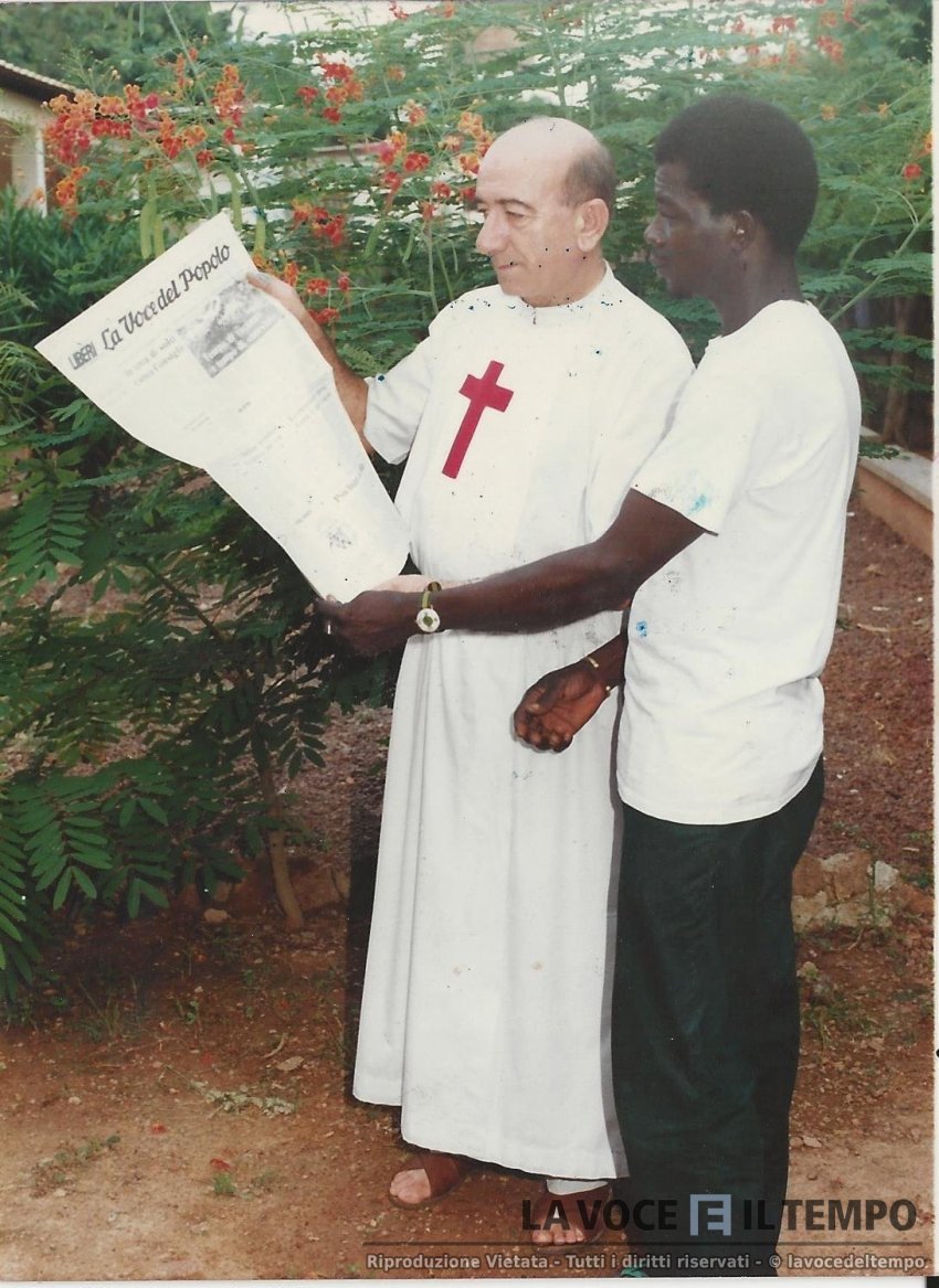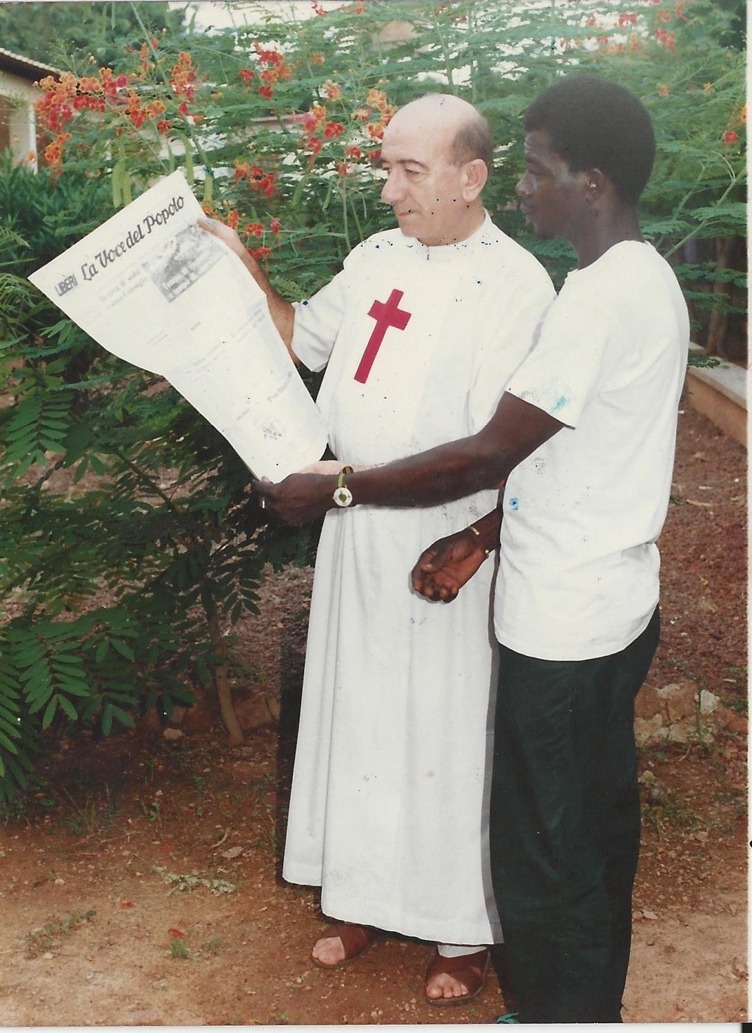 Sacerdote con ragazzo leggono "la voce del popolo"