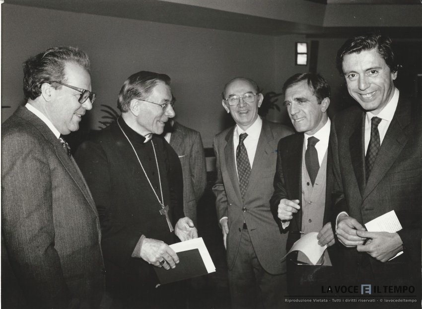Il Cardinale Arcivescovo con il professor Enrico Pizzetti, il presidente della Regione Piemonte Gian Paolo Brizio e il presidente dell'Unione Industriale Marzano