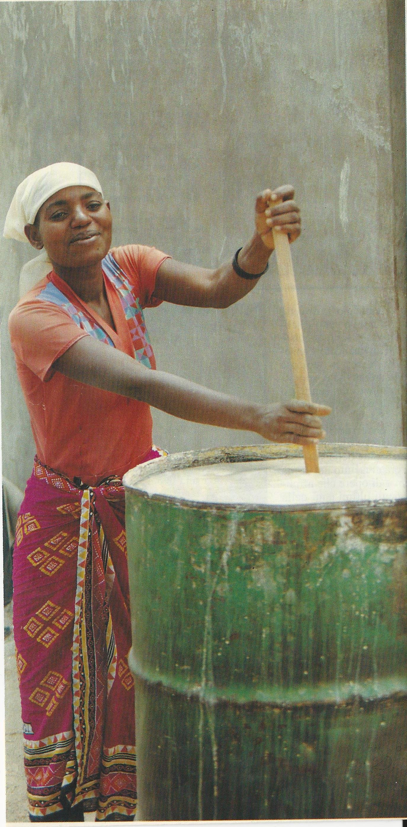 donna africana che mescola il latte in una pentolona, in Tanzania