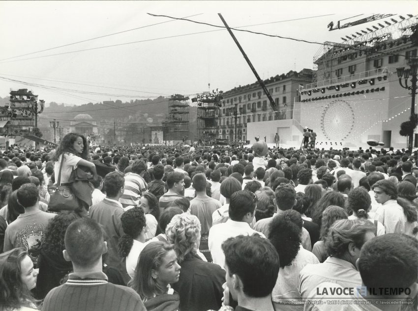 Fedeli in piazza Vittorio Veneto in attesa dell'arrivo di papa Wojtyla