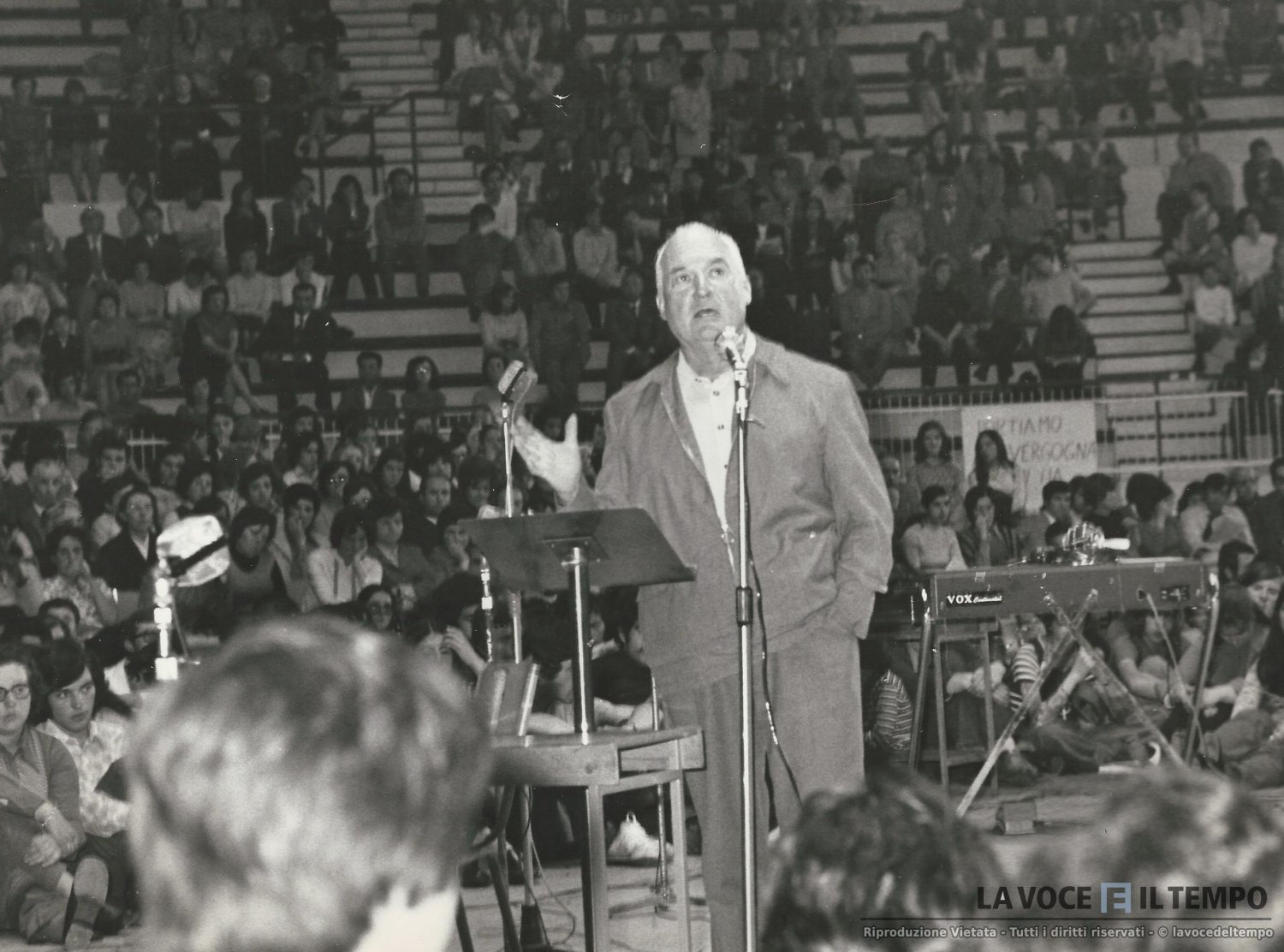 Fratel Carlo Carretto parla ai giovani nel palasport di Torino, nel "Pomeriggio di speranza" organizzato dal Sermig