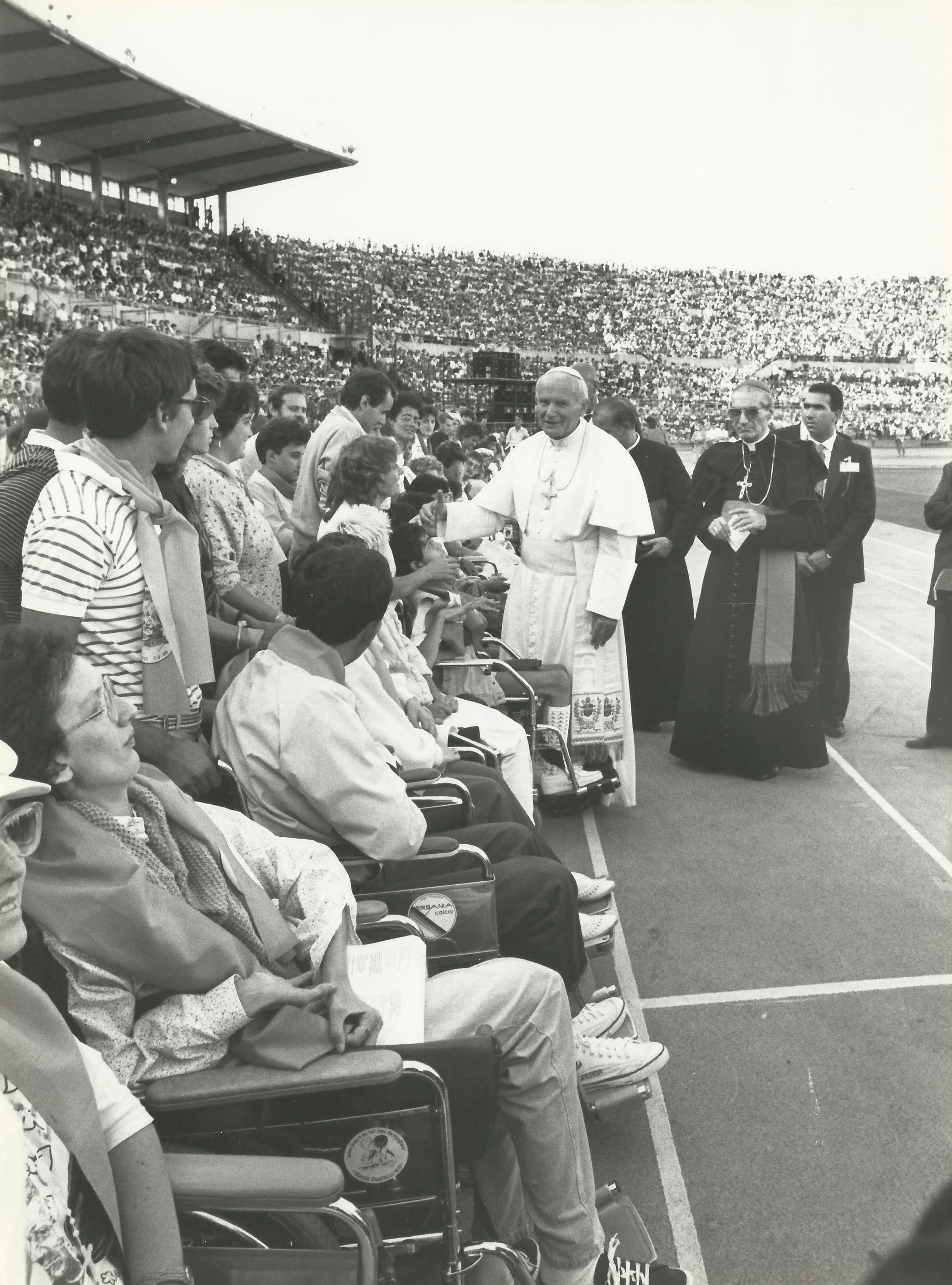 Il papa Giovanni Paolo II saluta un gruppo di disabili
