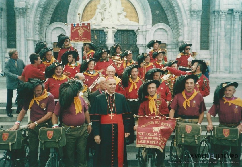 Il cardinale Poletto con la Fanfara dei Bersaglieri di Chieri e la pattuglia ciclistica, durante il pellegrinaggio diocesano a Lourdes