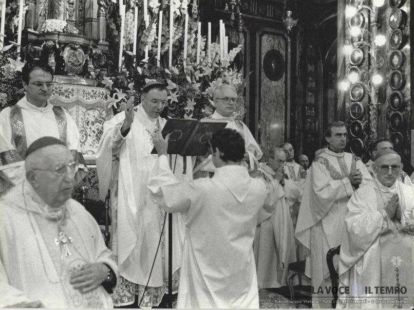 Il cardinale Saldarini insieme ad altri sacerdoti celebra la messa