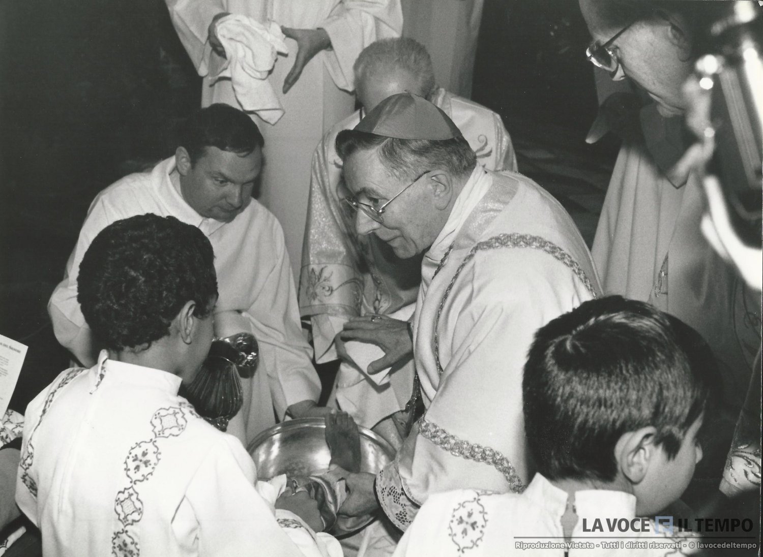 Il cardinale Saldarlni lava i piedi a un ragazzo in un giovedi santo