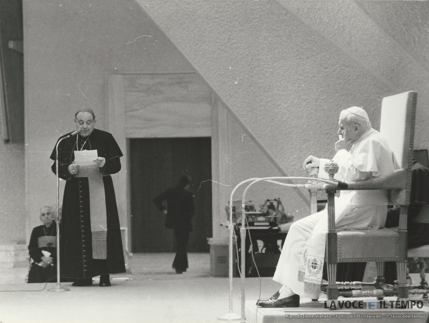 Il discorso del cardinale Ballestrero durante l'udienza con il papa Giovanni Paolo II, in sala Nervi, a Roma