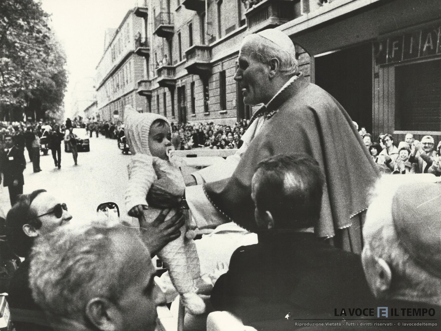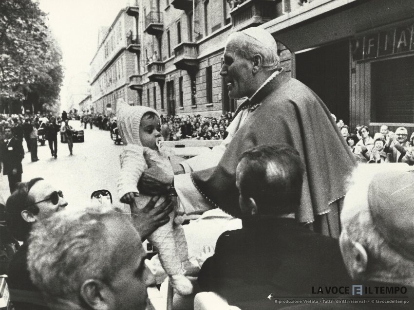 Il papa Giovanni Paolo II con un bambino in braccio, mentre attraversa le vie della città