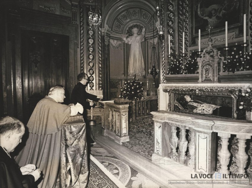 Il papa Giovanni Paolo II in preghiera nella chiesa di San Giuseppe Cottolengo, davanti all'urna del Santo