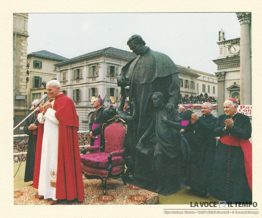 Il papa Giovanni Paolo II davanti alla statua di don Bosco in piazza Maria Ausiliatrice, a Valdocco