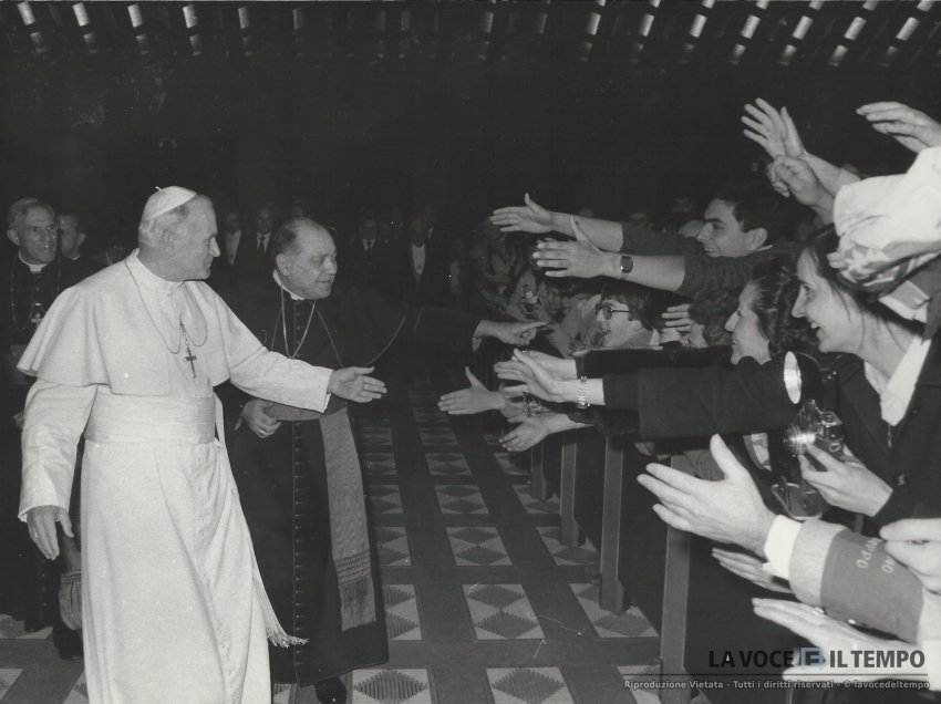 Il papa Giovanni Paolo II e il cardinale Ballestrero salutano la folla, durante l'udienza in sala Nervi, a Roma