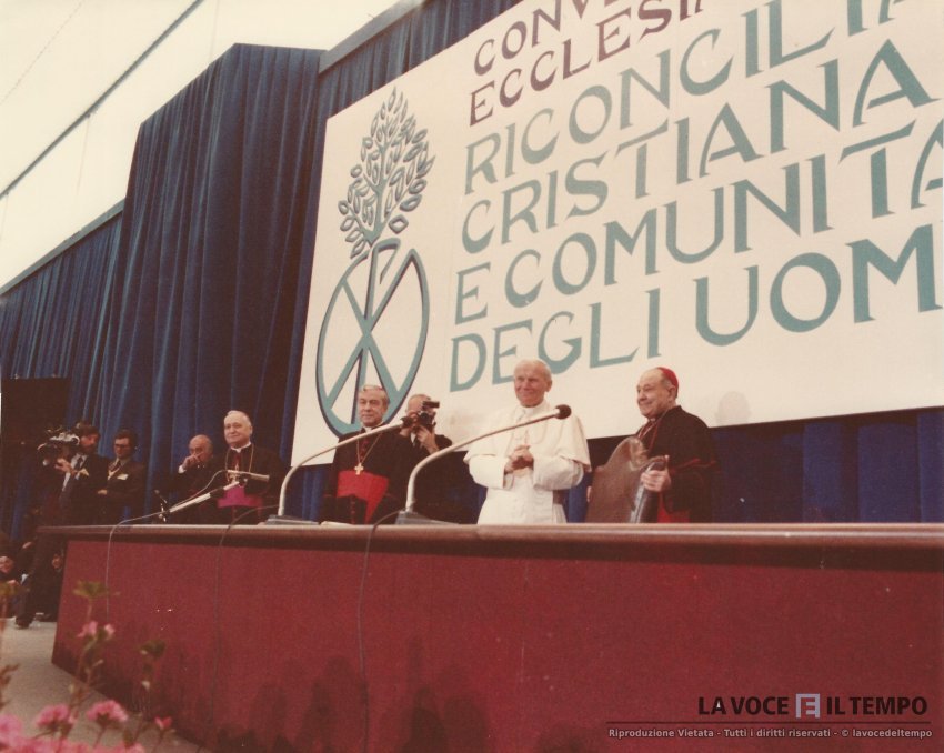 Il papa Giovanni Paolo II e il cardinale Ballestrero al Convegno Ecclesiale "Riconciliazione cristiana e Comunità degli uomini"