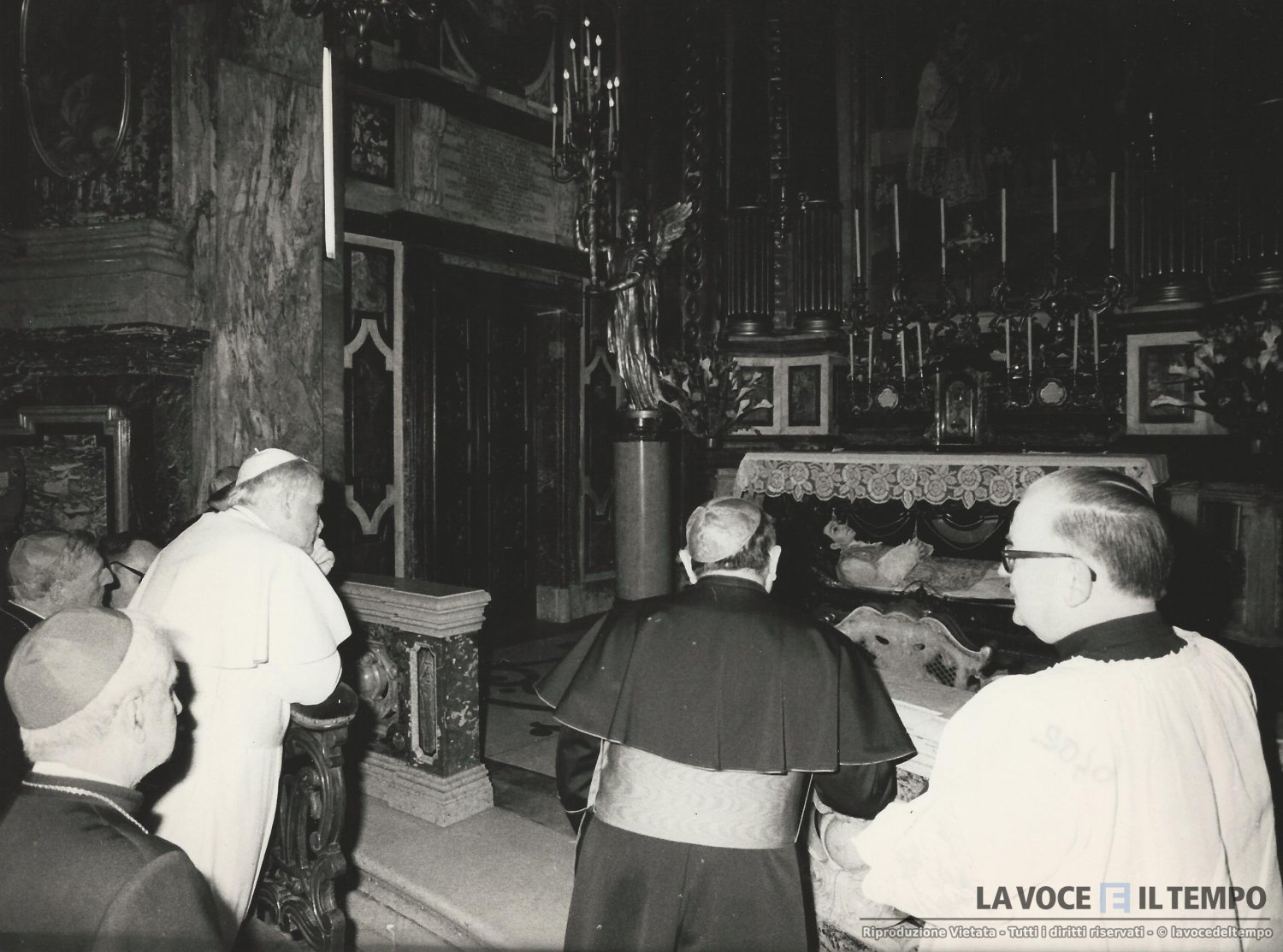 Il papa Giovanni Paolo II in preghiera al santuario della Consolata, davanti all'altare con l'urna di san Giuseppe Cafasso