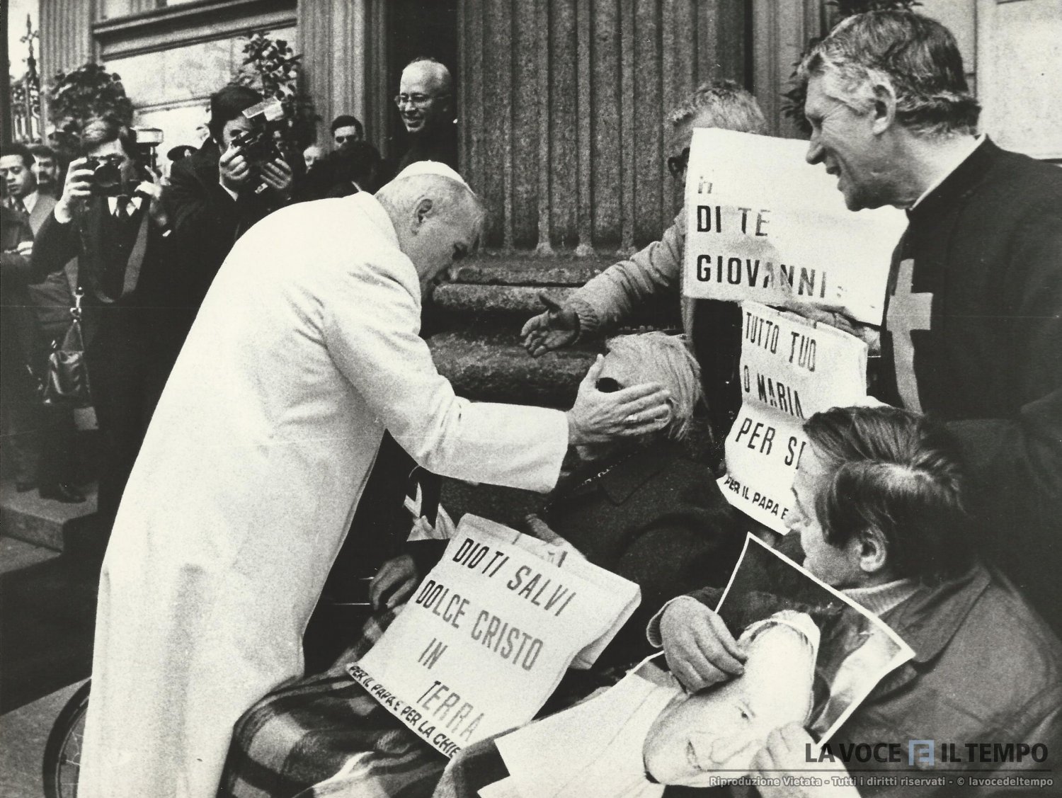 Il papa Giovanni Paolo II saluta alcuni disabili davanti al santuario della Consolata