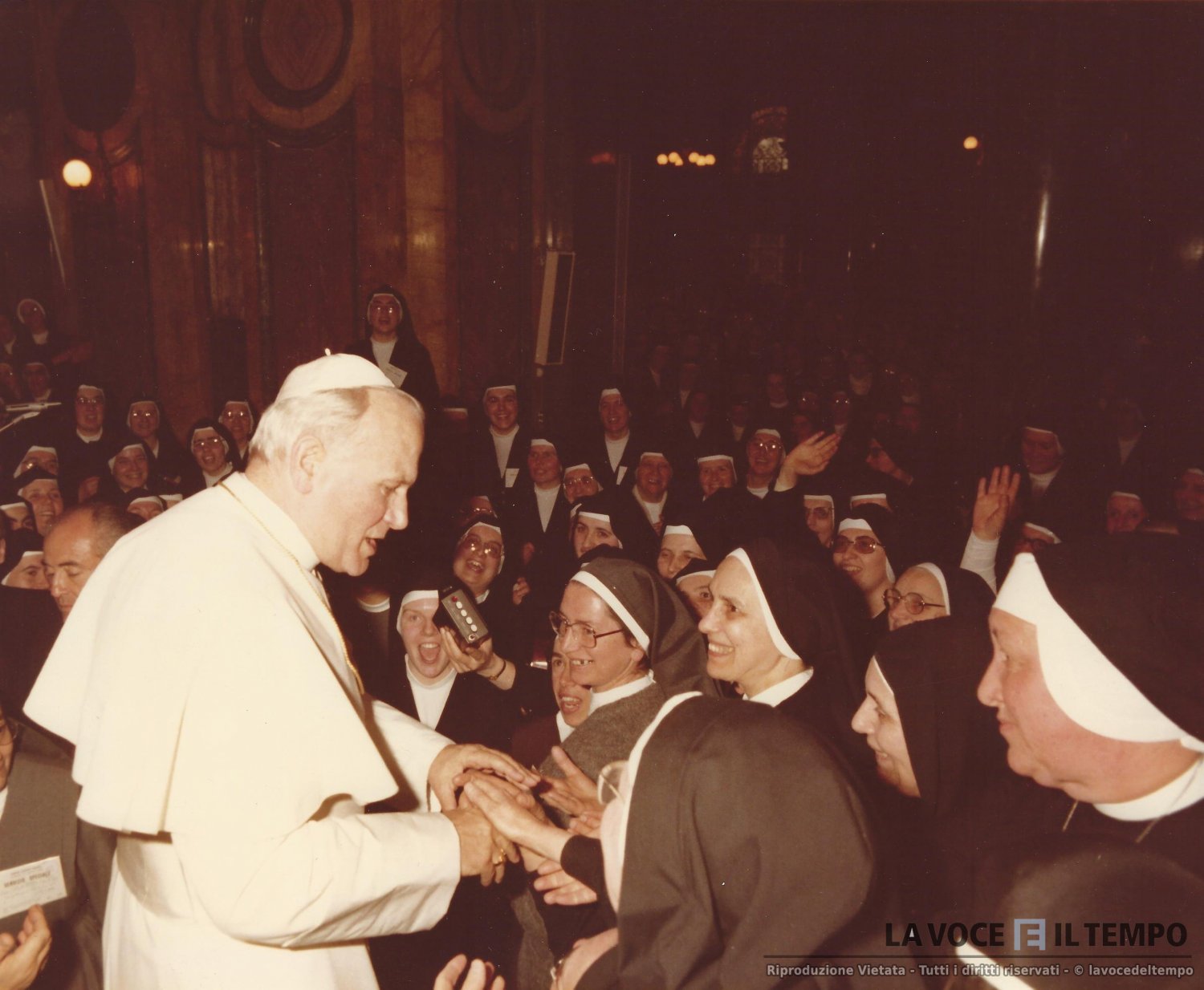 Il papa Giovanni Paolo II saluta un gruppo di suore all'interno della Basilica di Maria Ausiliatrice, durante l'incontro con le religiose delle diverse congregazioni