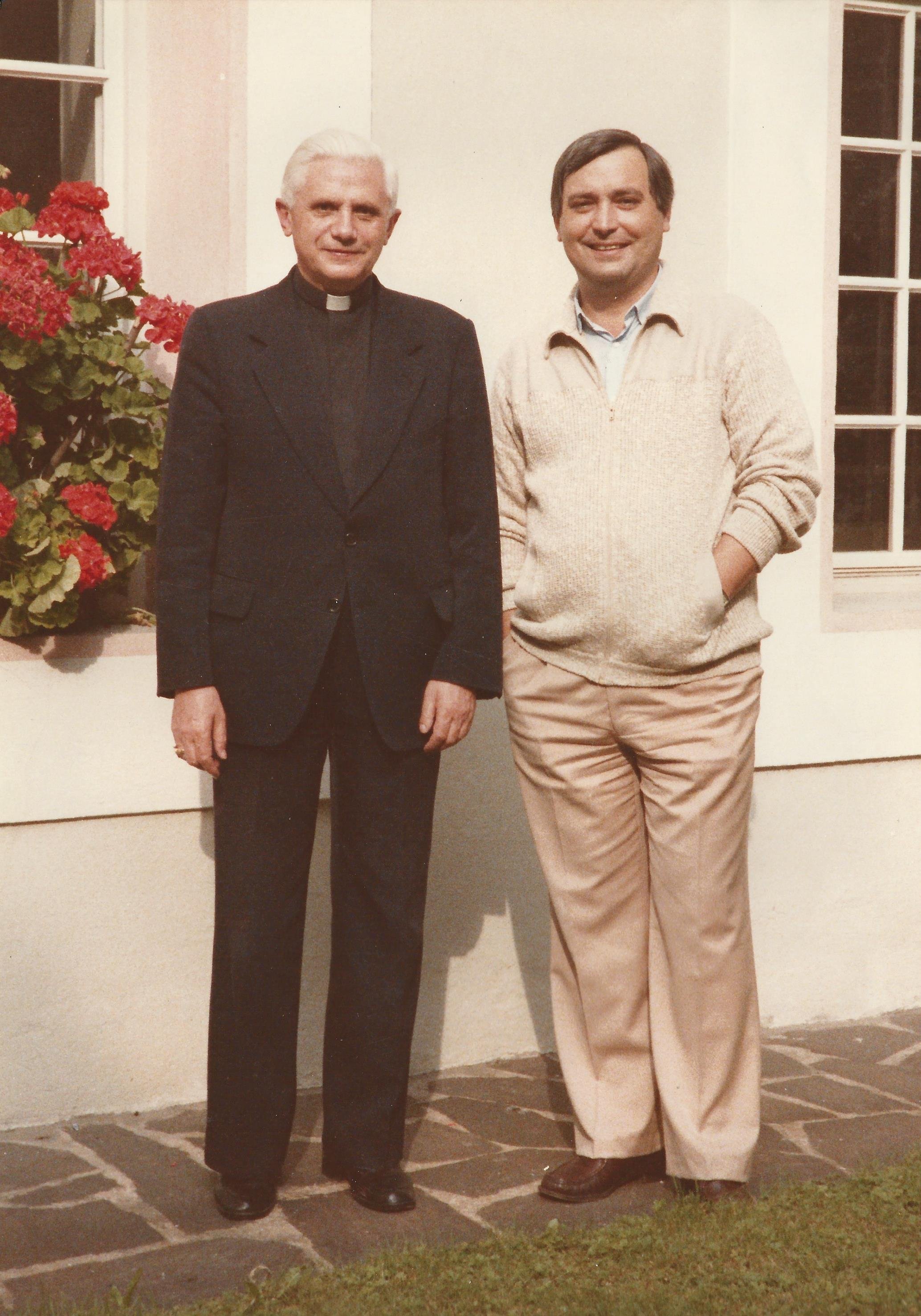 Il cardinale Joseph Ratzinger, con il giornalista di "Jesus" Vittorio Messori, dopo l'intervista di "Rapporto sulla Fede", a Bressanone