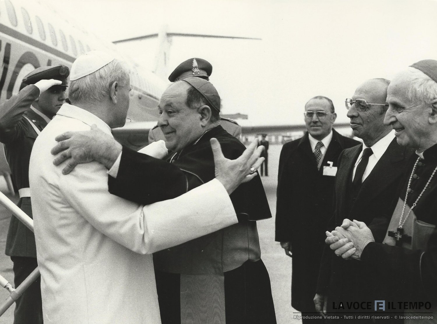 L'abbraccio tra il papa Giovanni Paolo II e il cardinale Ballestrero, all'arrivo all'aeroporto di Caselle