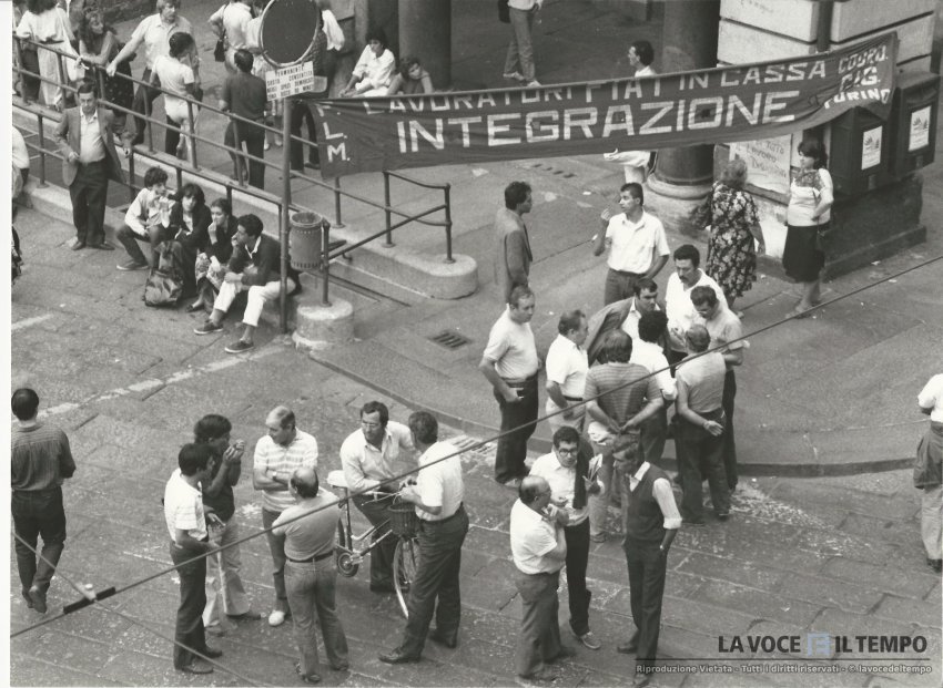 Gruppo di dipendenti della Fiat e disoccupati davanti al municipio di Torino