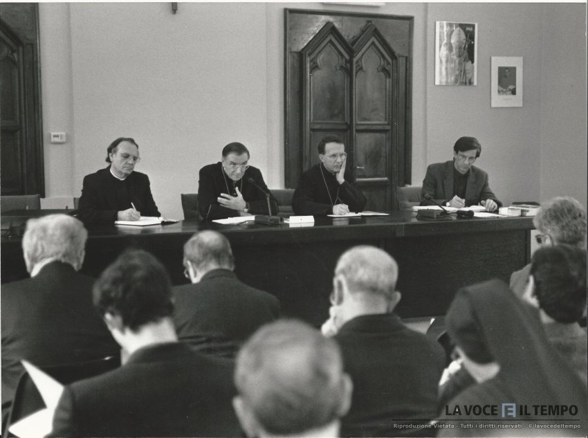 lavori commissione sinodale con don Giovanni Carrù, il Cardinale Giovanni Saldarini, mons. Piergiorgio Micchiardi e Umberto Casale