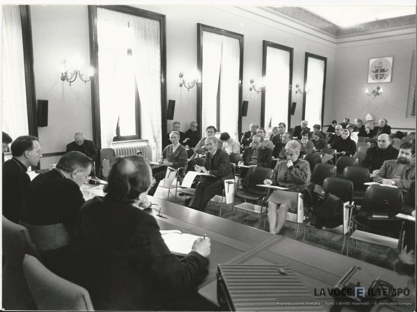 lavori del sinodo torinese con il cardinale giovanni saldarini, don piergiorgio micchiardi