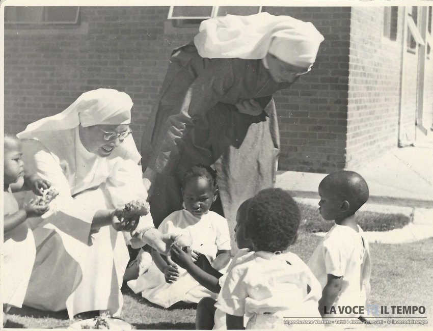 Presso le miniere d'oro di Welkon nell'Africa del Sud Orange dei bambini si trastullano felici in compagnia di alcune suore della missione medica sui prati dell'ospedale "Sir Ernest Oppenheimer"