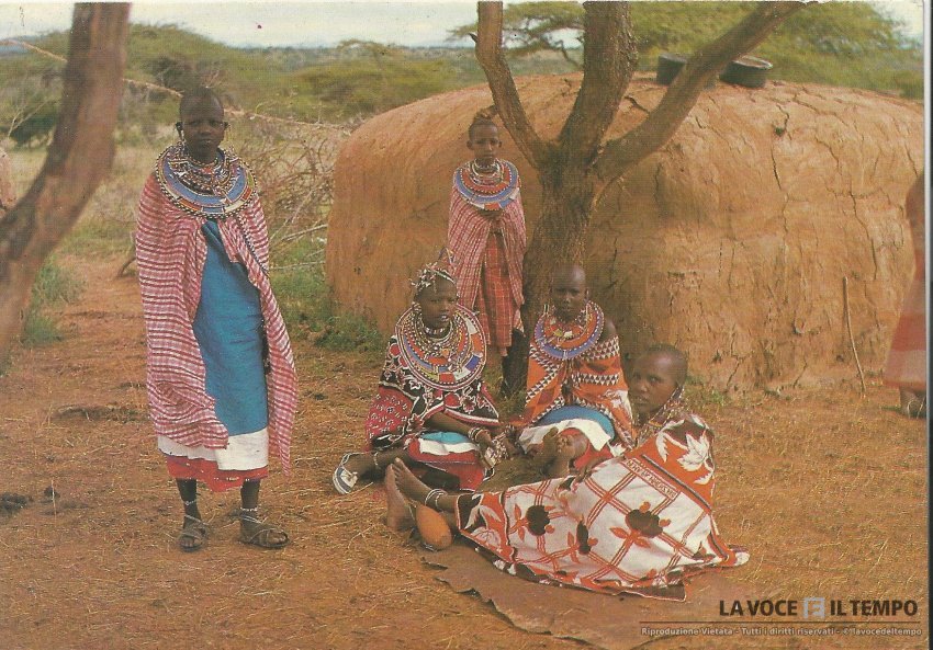 ragazzi con costumi tipici di fronte ad un edificio nel terzo mondo