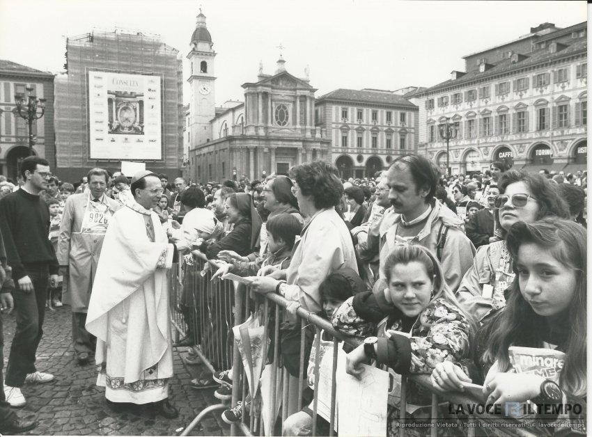 Monsignor Pier Giorgio Micchiardi salurta in piazzia San Carlo a Torino