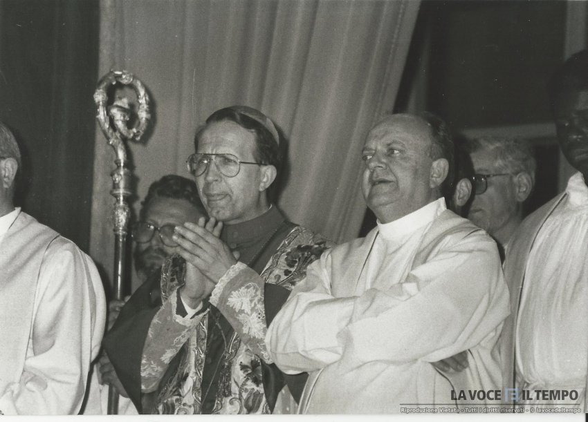 Il monsignor Micchiardi prega con altri preti