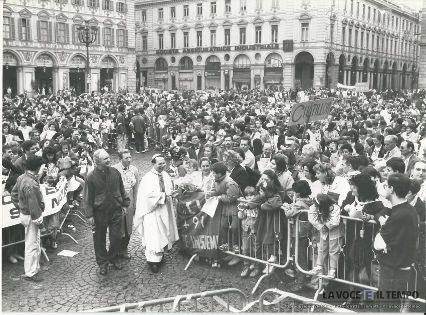 il monsignor micchiardi cammina tra la folla in piazza S. Carlo