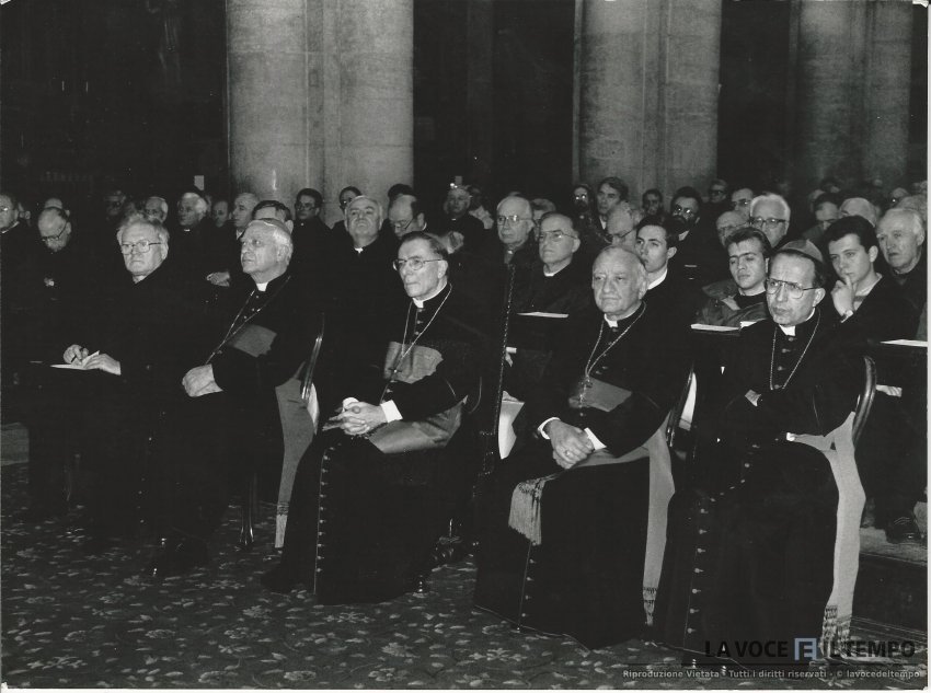 da sinistra: mons. Franco Peradotto, mons. Luigi Bettazzi, il Cardinale Arcivescovo di Torino, mons. Natalino Pescarolo e mons. Piergiorgio Micchiardi.