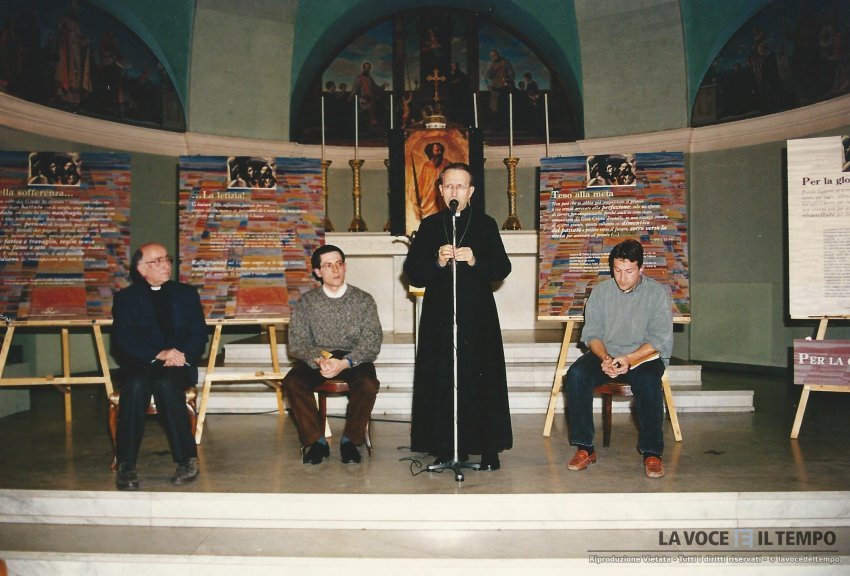 Monsignor Pergiorgio Micchiardi al microfono, con padre Antonio Bianchi e i 2 curatori della mostra Paolo Desandré e Renato Mazzocchi della Fraternità di San Carlo