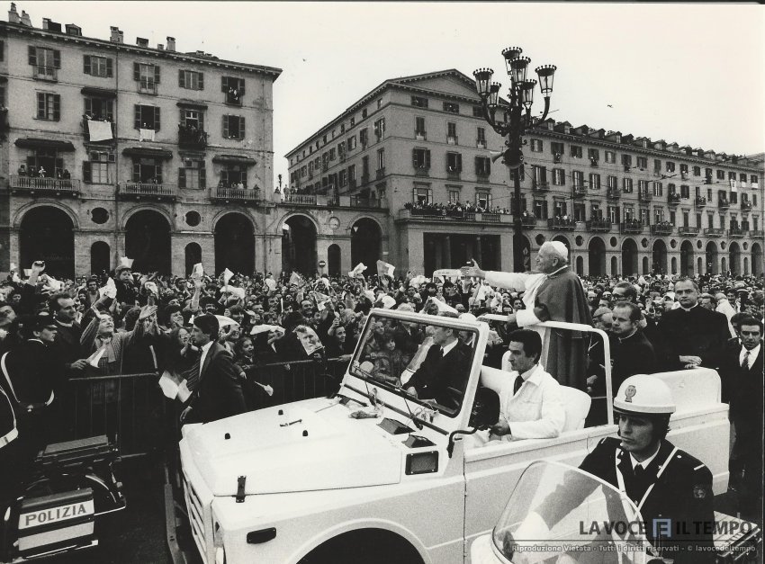 Il Papa saluta la folladalla papamobile durante la visita a Torino