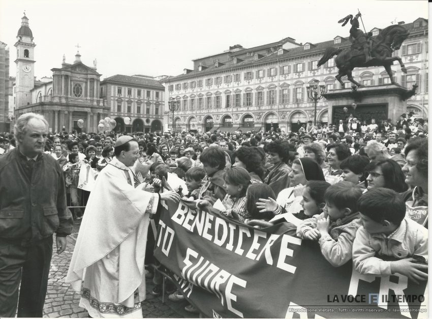 Monsignor Pier Giorgio Micchiardi saluta la folla in piazza San Carlo a Torino