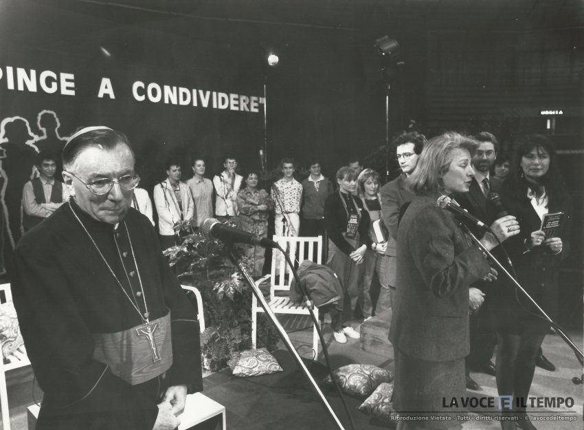 Il cardinale si trova al palasport immortalato mentre ascolta Incisa Cattaneo, dietro di lui Antonello Angeleri e Giampiero Leo