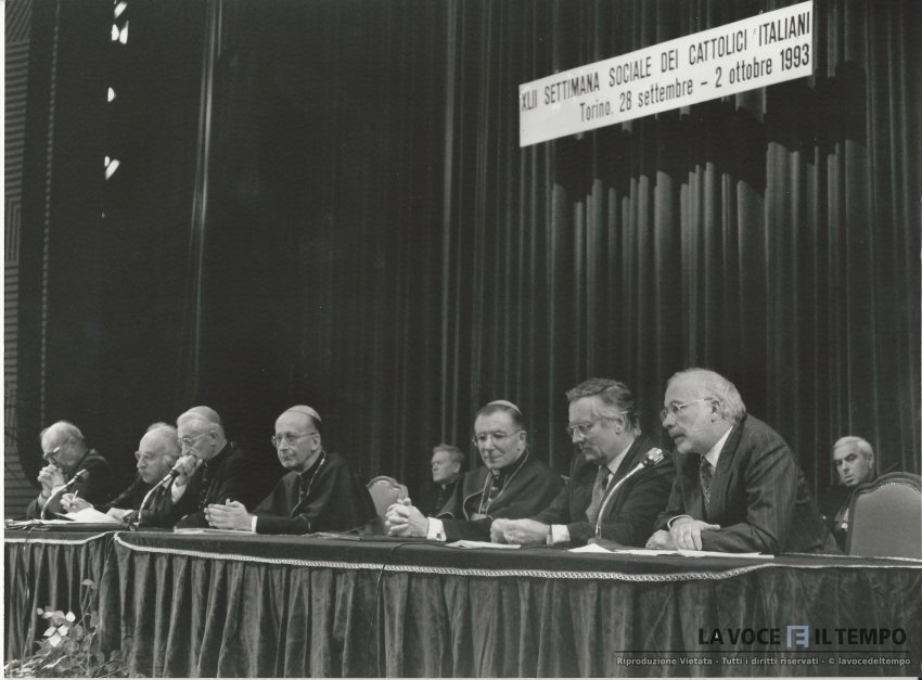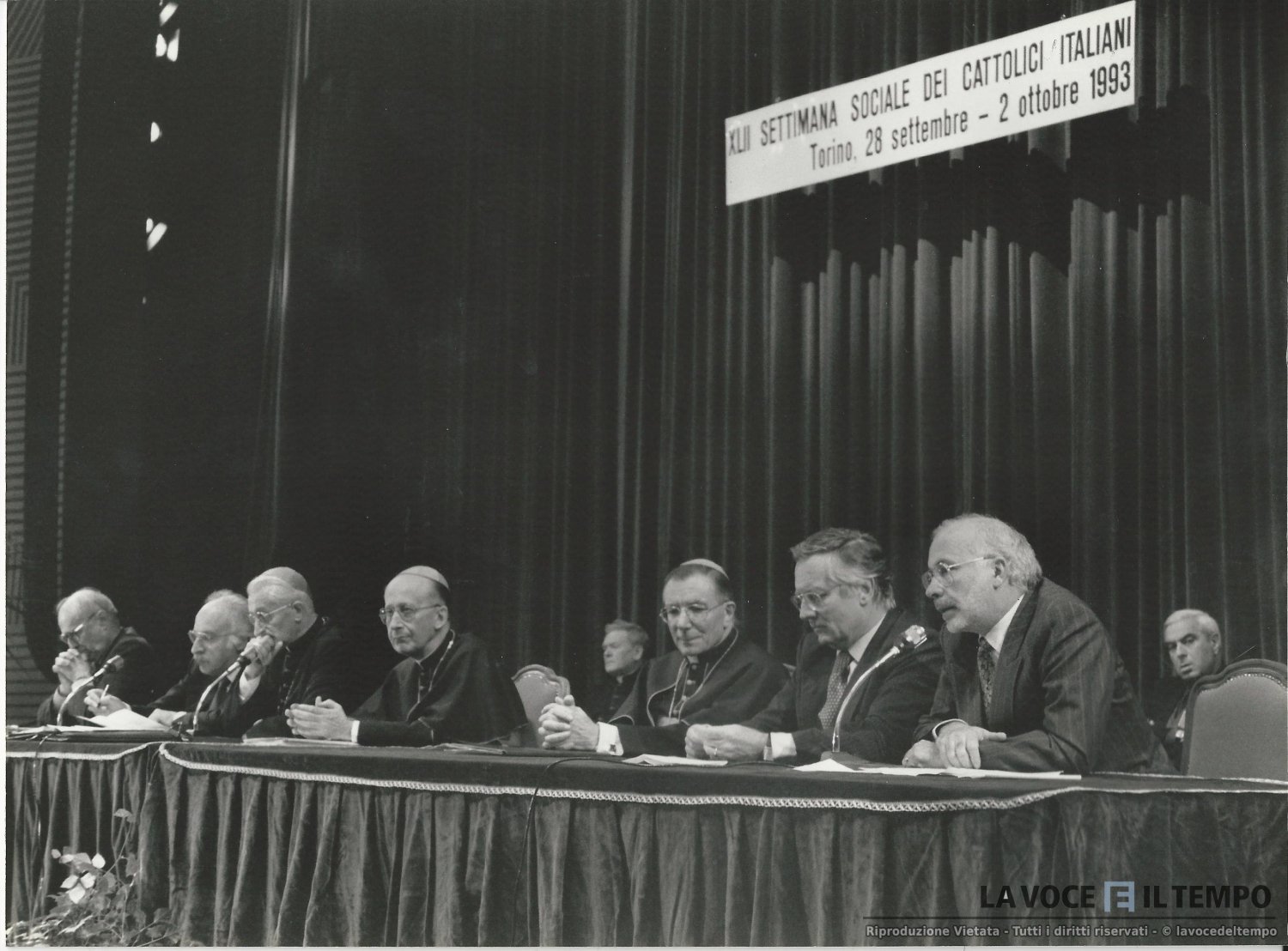 da destra: Ugo Perone, Valentino Castellani, Giovanni saldarini, Camilllo ruini, ferdinando chairre, adriano bausola